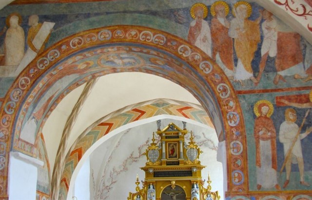 Foto: kirkefotos.dk / De romanske kalkmalerier fra ca. 1150‑1175 på triumfmuren i Jørlunde Kirke. Til venstre ses nederst Brylluppet i Kana og ovenover Lazarus’ opvækkelse. Til højre er øverst Tilfangetagelsen, mens Korsfæstelsen er gengivet nedenunder.